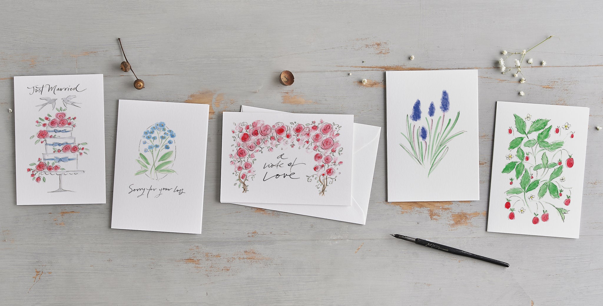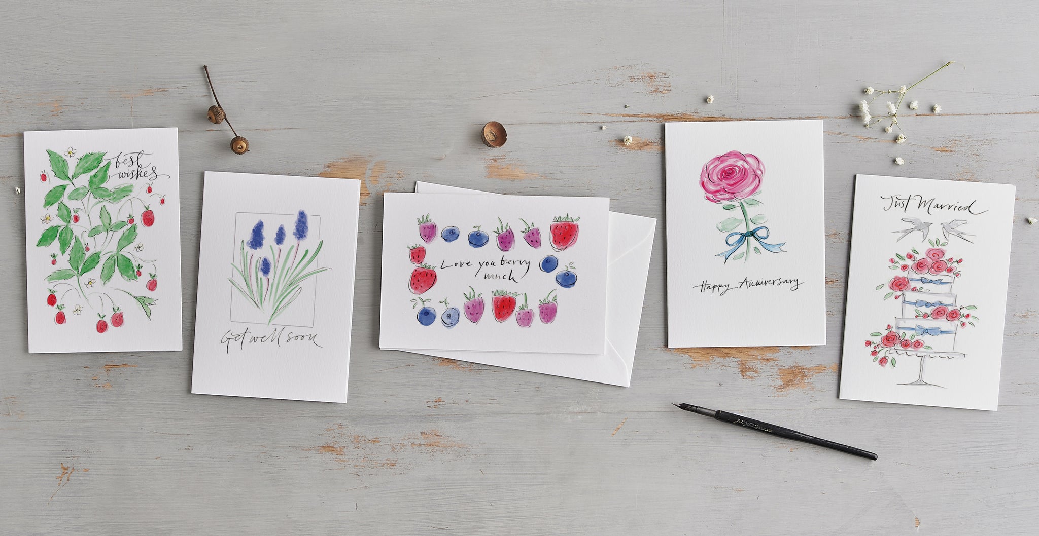 The illustrations and modern caligraphy are originally hand drawn with dip pens, inks and watercolours in loose, free-flowing styles.
